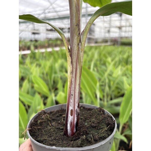 Younger plants are green with a light silvery sheen on the trunk. Its growth habit differs considerably from the well-known Musa basjoo. While Musa basjoo grows steadily upward and also develops a nicely filled-out width with broad leaf formation, the Thai Black mainly focuses on height. In nature, this can result in specimens reaching up to 7 meters tall. In Europe, however, this variety remains much smaller. Thai Black is best kept in a pot.